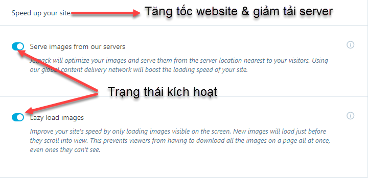 - Serve images from our servers: Bình thường ảnh sẽ lưu trữ trên hosting của bạn, tuy nhiên khi tính năng này kích hoạt, ảnh sẽ được lưu trữ trên server của WordPress, điều đó giúp cho hosting của bạn đỡ nặng gánh, và có thể giúp tăng tốc độ website. Đặc biệt hữu ích nếu host của bạn không mạnh hoặc/và bị giới hạn băng thông. Tùy chọn tối ưu: Tùy thuộc vào sức mạnh hosting bạn dùng.