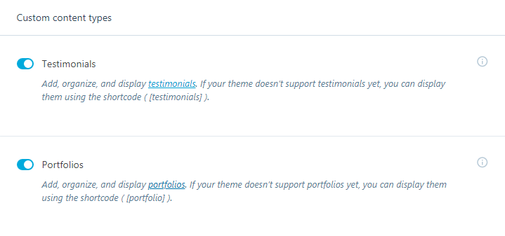 - Custom content types: Đây là các nội dung tùy chỉnh liên quan đến lời chứng thực (testimonials) và portfolios. Khi bạn kích hoạt tính năng này JetPack sẽ cung cấp thêm cho bạn 2 tùy chỉnh liên quan, và bạn có thể sử dụng các shortcode tương ứng là [testimonials] và [portfolios] để chèn vào bài viết tương ứng. Tùy chọn tối ưu: Tùy thuộc sở thích của bạn.