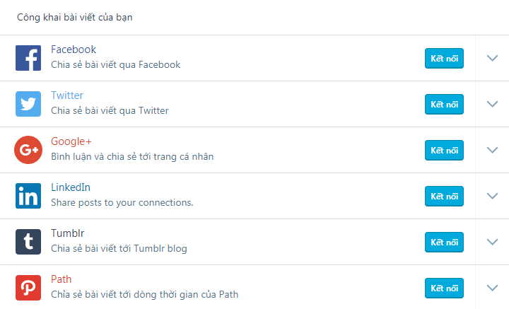 - Automatically share your posts to social networks: Khi chức năng này được kích hoạt nó sẽ tự động chia sẻ các bài đăng của bạn lên mạng xã hội, điều này có thể giúp bạn đỡ mất công đăng thủ công. Bạn click vào liên kết Connect your social media accounts để thực hiện việc kết nối với các tài khoản mạng xã hội mà bạn muốn tính năng này hoạt động. Hiện JetPack hỗ trợ các mạng xã hội sau:
