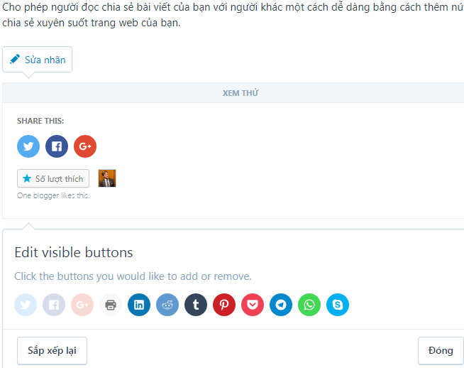 - Add sharing buttons to your posts: Khi tính năng này được kích hoạt nó sẽ chèn các nút chia sẻ vào cuối bài viết. Bạn hoàn toàn quyết định được nút chia sẻ nào có trong bài viết ở phần tùy chỉnh Configure your sharing buttons.