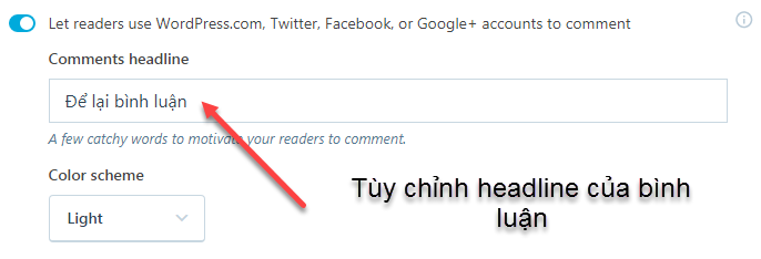 - (Comments) Let readers use WordPress.com, Twitter, Facebook, or Google+ accounts to comment: Chọn lựa của cá nhân mình là Nên dùng. Nếu bạn kích hoạt tính năng này website sẽ cho phép người dùng có 2 cách để gửi bình luận, một như kiểu truyền thống, và cách còn lại là thông qua một trong các tài khoản WordPress, Twitter, Facebook hoặc Google+. Bạn cũng có thể tùy chỉnh headline của khu vực bình luận: