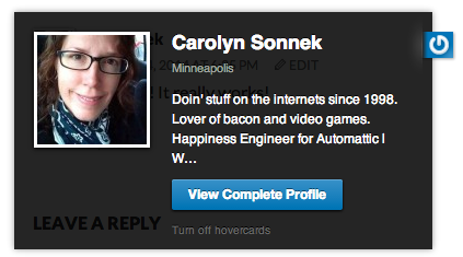 - (Comments) Enable pop-up business cards over commenters’ Gravatars: Chọn lựa của cá nhân mình là Nên dùng. Nếu bạn kích hoạt tính năng này, và nếu người bình luận có tạo tài khoản trên mạng gravatar toàn cầu thì khi hover chuột qua ảnh, các thông tin chi tiết của người đó sẽ hiện lên (ví dụ như blog của họ, các mạng xã hội mà họ dùng). Trông nó sẽ giống như thế này: