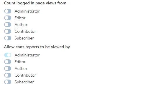 - Site stats (Count logged in page views from): Mặc định là tắt. Khi được bật, nó sẽ tính toàn số lần xem trang của cả những người quản trị website. Lựa chọn cá nhân: Tắt.