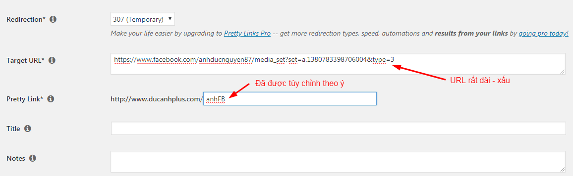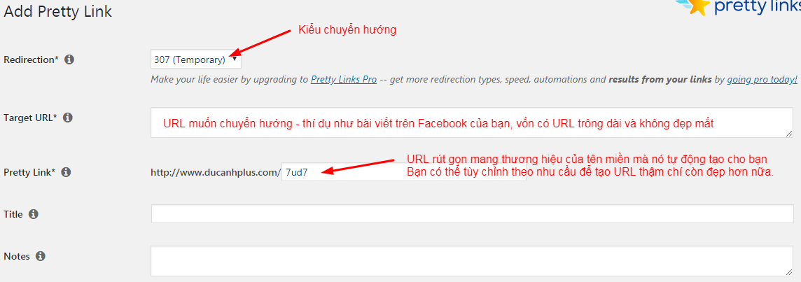 - Title: Phần không quan trọng, bạn nên bỏ trống. Pretty Links sẽ tự động lấy tiêu đề của URL