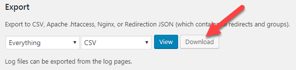 Bạn chuyển sang tab Import/Export ở phần điều chỉnh cho plugin Redirection, và ở đây chúng ta biết được rằng cần phải tải file có định dạng CSV lên. Để biết cấu trúc file CSV đó ra làm sao, bạn cần tải thử một file CSV về như sau: