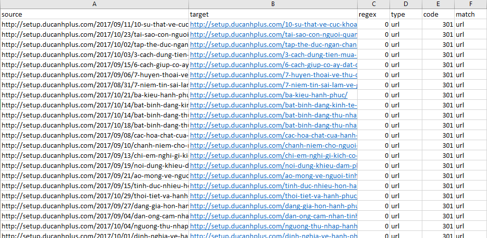 OK, giờ thì bạn đã có tất cả URL bài viết trên website rồi. Tiếp theo chúng ta cần biết cách làm thế nào để thực hiện chuyển hướng toàn bộ URL này.