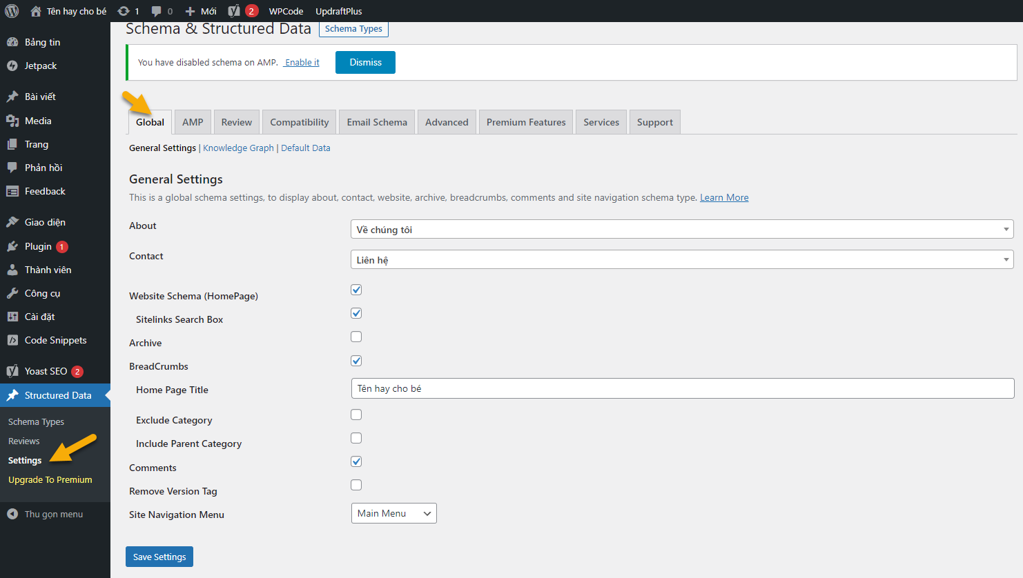 #1. Đầu tiên bạn vào Structured Data > Settings để tiến hành cài đặt tổng quan