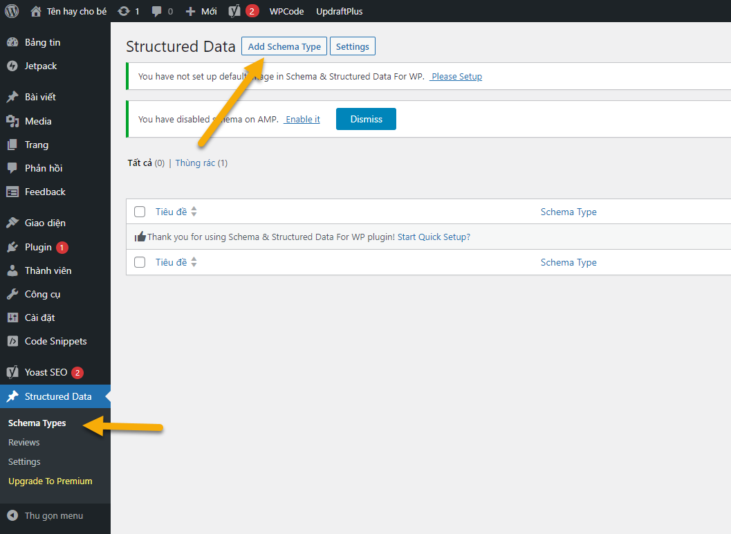 Bạn vào Schema Type (mục đầu tiên trong Structured Data). Click vào Add Schema Type ở trên cùng: