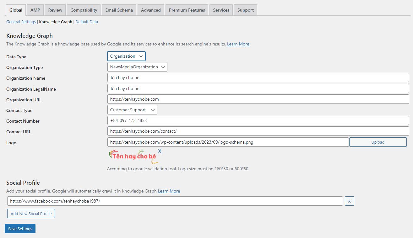 - Social Profile: hồ sơ mạng xã hội của website. Có thể là Facebook, YouTube, hay bất cứ mạng xã hội nào mà bạn triển khai cho website của bạn.