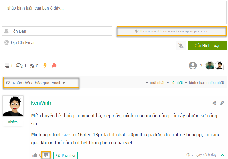 B. Tiếp đến là phần nhận thông báo qua email. Đây là tính năng giúp người bình luận nhận được thông báo qua email nếu bình luận của họ được trả lời hoặc bình luận của bài viết họ quan tâm có ai đó bình luận. Nhìn chung thì tính năng này khá hữu ích nhưng nó có 2 vấn đề: