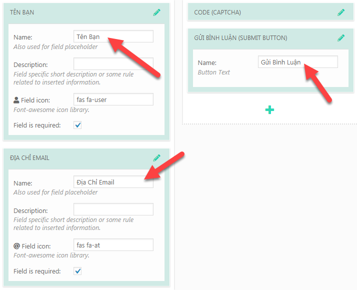 Để đổi thành tiếng Việt cho tên các trường điền trong form, bạn làm như sau (đổi thành nhãn tùy thích ở trong khu vực mũi tên đỏ chỉ vào):