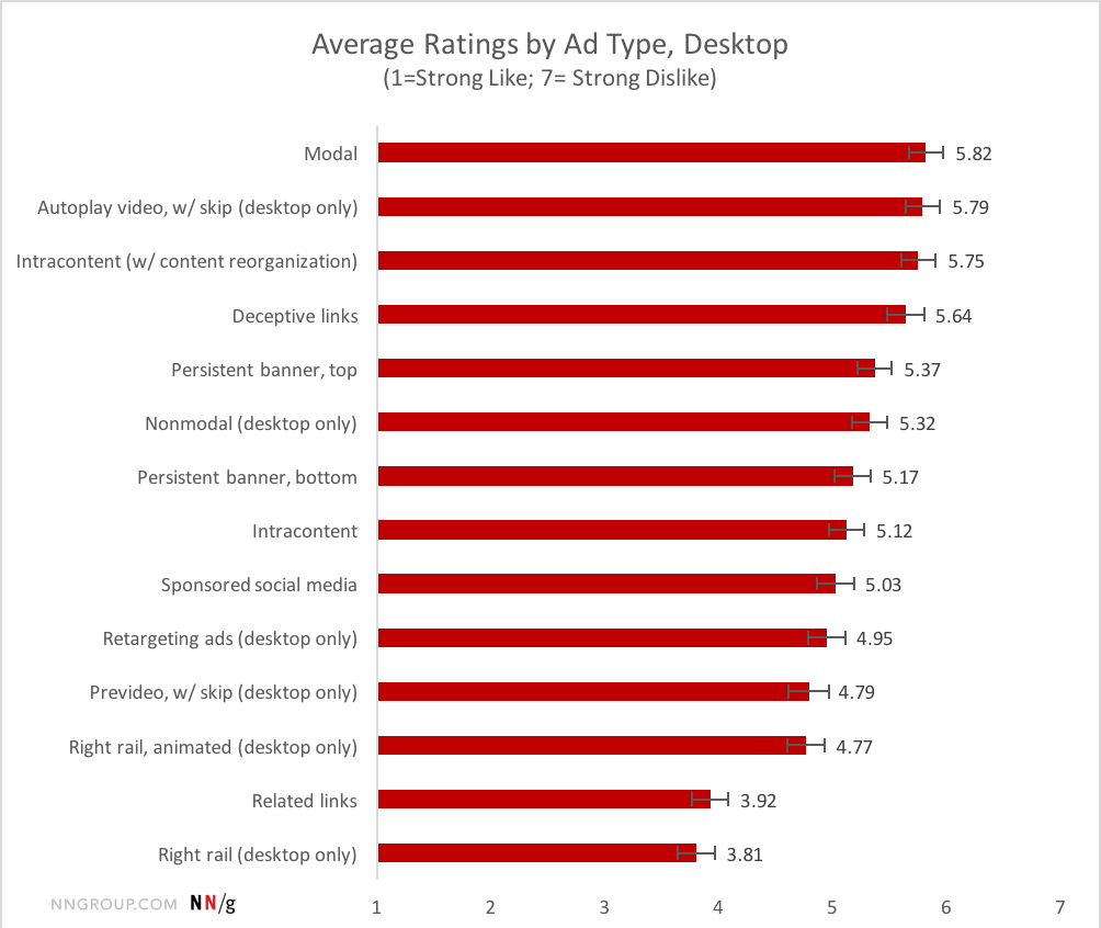Tương phản Turkey chỉ ra rằng bốn mẫu quảng cáo bị ghét nhất trên máy bàn không có sự khác biệt nhiều với nhau, nhưng chúng có sự khác biệt đáng kể với tất cả các kiểu quảng cáo khác (có một ngoại lệ: các quảng cáo liên kết bẫy không khác biệt so với banner ghim cố định ở vị trí đầu), vì thế sẽ là công bằng khi nói rằng danh hiệu cho quảng cáo bị ghét nhất trên máy bàn là mối liên kết bốn chiều giữa quảng cáo kiểu modal, quảng cáo video tự động bật, quảng cáo intracontent làm xáo trộn nội dung khi chúng tải, và quảng cáo liên kết bẫy, cái trông giống nội dung nhưng thực ra là quảng cáo. Mẹo quan trọng: đừng chạy các kiểu quảng cáo này nếu bạn muốn mọi người thích bạn.