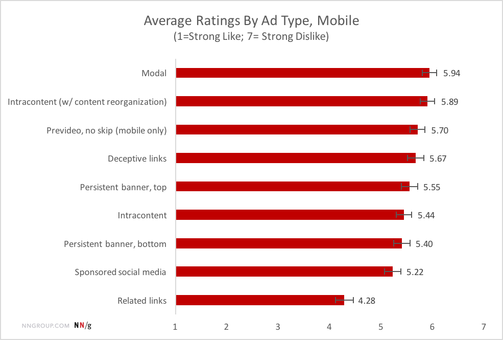 Kiểu quảng cáo các liên kết liên quan là quảng cáo chiến thắng rõ ràng trên nền tảng di động: nó được chọn là ít bị ghét nhất và khác biệt đáng kể so với các xếp hạng của tất cả các kiểu quảng cáo khác.