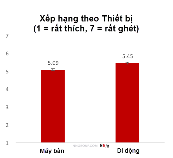 Phân tích phương sai (ANOVA) về kiểu quảng cáo và thiết bị cho thấy mọi người ghét quảng cáo di động hơn so với họ ghét quảng cáo trên máy bàn (máy bàn có điểm số trung bình là 5,09 trong khi điểm trung bình của di động là 5,45; sự khác biệt có ý nghĩa thống kê ở đây là p < 0,0001). Ảnh hưởng của kiểu quảng cáo (sẽ được thảo luận sau) cũng có ý nghĩa thống kê (p < 0,0001).