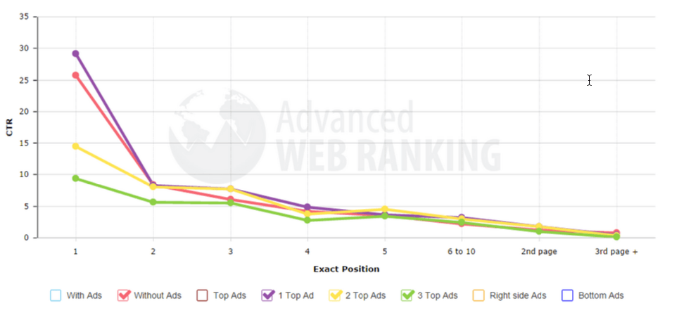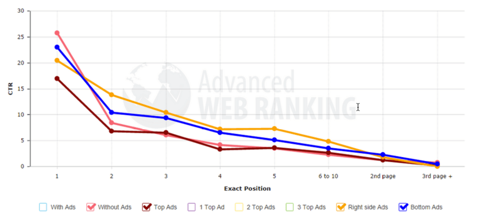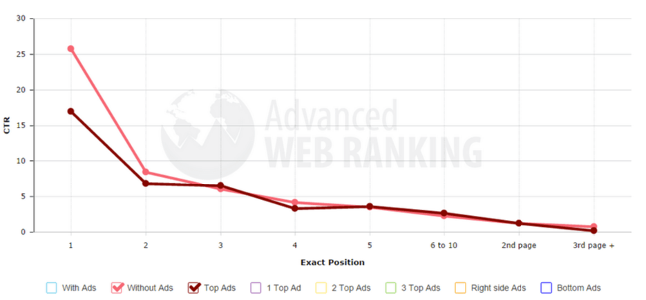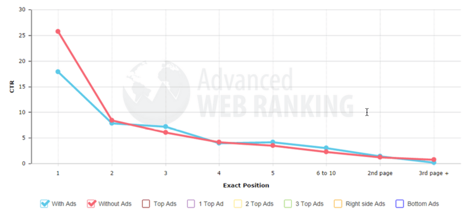 CTR tự nhiên cho vị trí đầu tiên trong kết quả tìm kiếm rớt khoảng 20,6% khi quảng cáo xuất hiện ở cột phải của trang, và khoảng 10,7% khi quảng cáo xuất hiện ở chân trang.