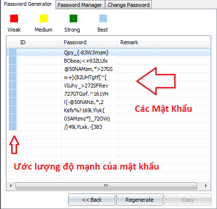 Biểu tượng ở bên trái ngoài cùng dùng để ước lượng độ mạnh của mật khẩu. Bạn có thể nhìn lên trên để thấy 4 màu khác nhau tượng trưng cho độ mạnh, với mầu đỏ đại diện cho mật khẩu yếu (Weak), rồi sau đó tăng dần đến màu xanh nhạt là mật khẩu mạnh nhất (Best). Tính năng ước lượng này rất có ích. Nó giúp bạn đánh giá được các tùy chọn tạo mật khẩu đã đủ tốt chưa, và mật khẩu vừa tạo ra có đáng tin dùng hay không. Dĩ nhiên bạn chỉ nên dùng các mật khẩu có độ mạnh cao nhất hoặc ít nhất cũng phải là Strong (màu Xanh lá)….