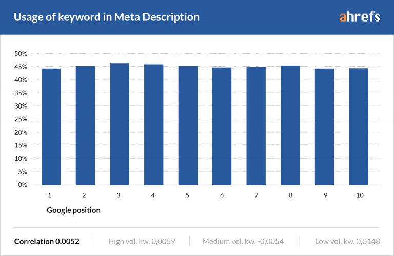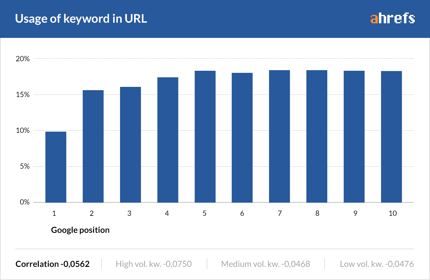 Theo dữ liệu của chúng tôi, việc sử dụng khớp từ khóa chính xác trong Tiêu đề, URL, H1 hoặc thậm chí là cả bên trong nội dung thực tế của trang không có mối tương quan lớn với thứ hạng trên Google.