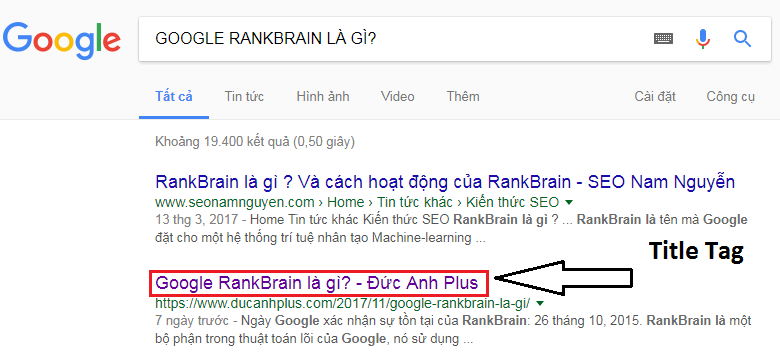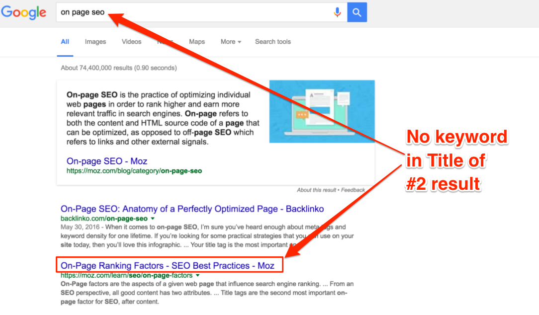 Buồn cười là, thậm chí cả kết quả ở vị trí số 2 cho từ khóa “SEO onpage” [bản gốc tiếng Anh, từ khóa là “on page SEO”] cũng không phải là khớp chính xác từ khóa trong thẻ “tiêu đề”: