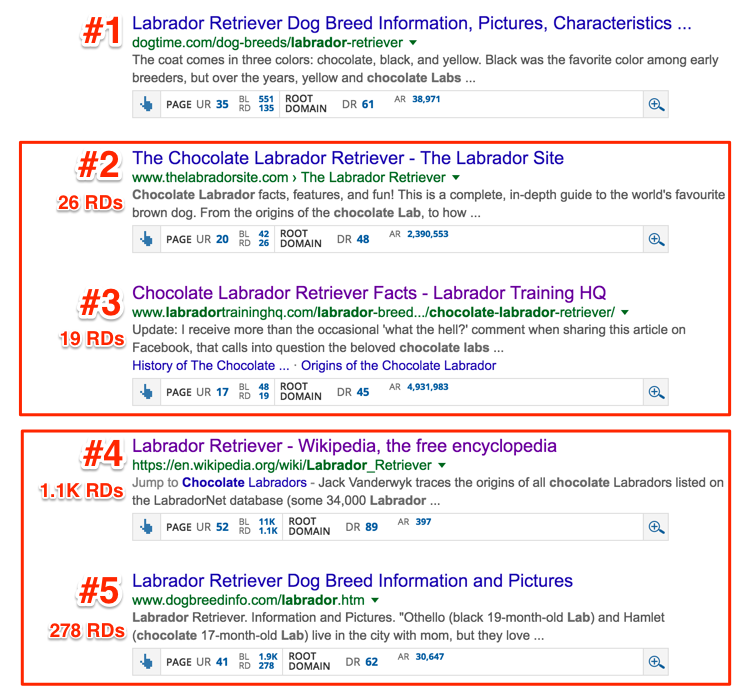 Hai trang đầu tiên có thứ hạng rất cao mặc dù có ít backlink bởi vì chúng chỉ nói về chủ đề “chocolate labs”.