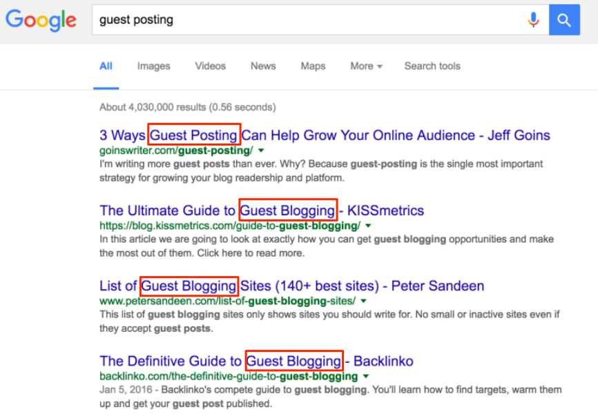 Rõ ràng là Google hiểu “guest posting” và “guest blogging” là hai từ có nghĩa khá giống nhau và đó là lý do vì sao khi bạn google các từ khóa “guest posting”, “guest blogging” và “guest writing” – bạn sẽ thấy khá nhiều trang tương tự nhau chiếm ở các vị trí top10 (nhưng theo thứ tự khác nhau chút ít).