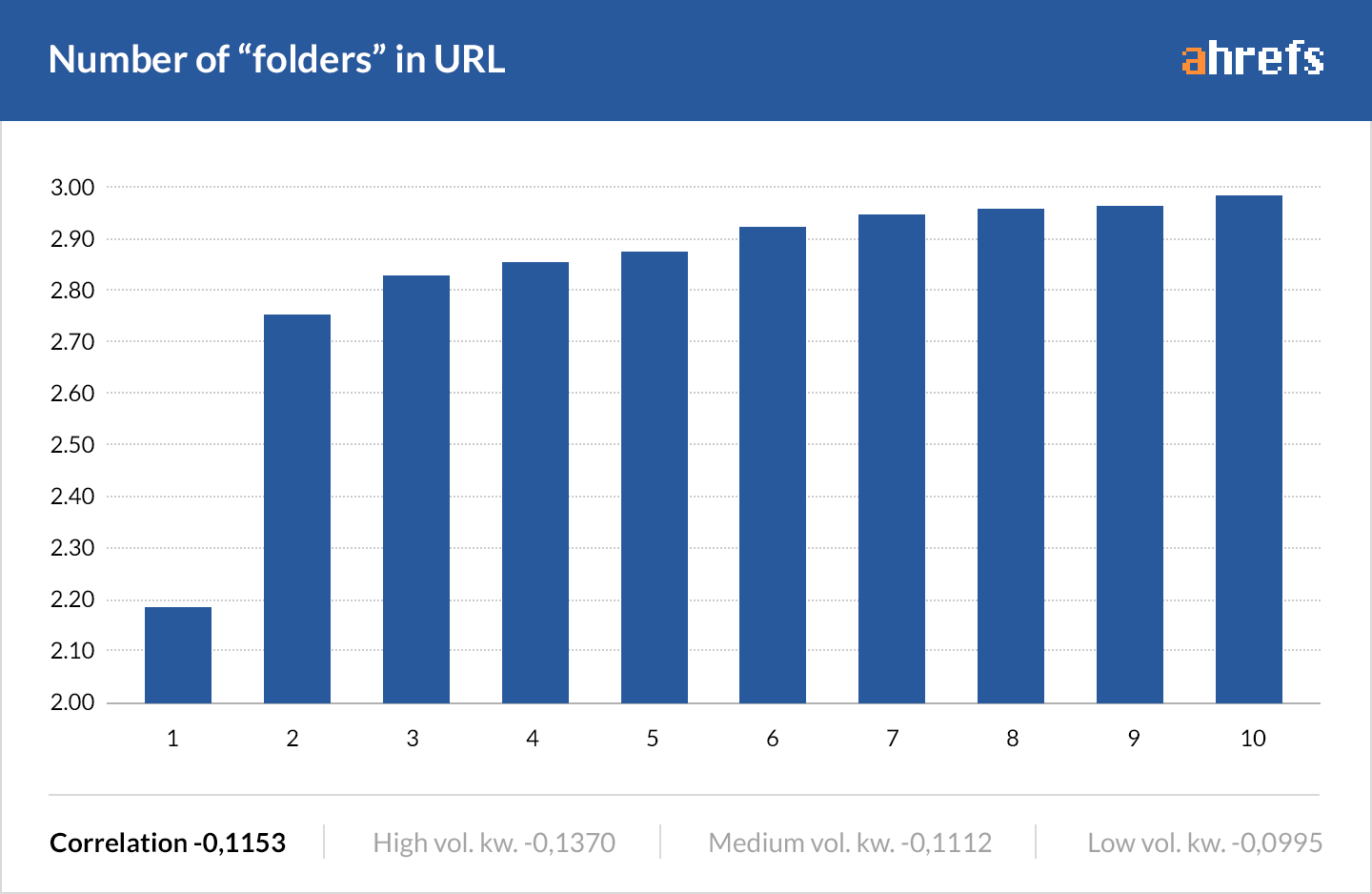 Vì thế chúng tôi nghiên cứu để xem xem có bất kỳ mối tương quan nào giữa số lượng “thư mục” trong URL và thứ hạng hay không: