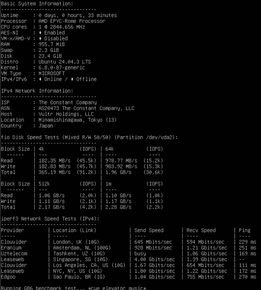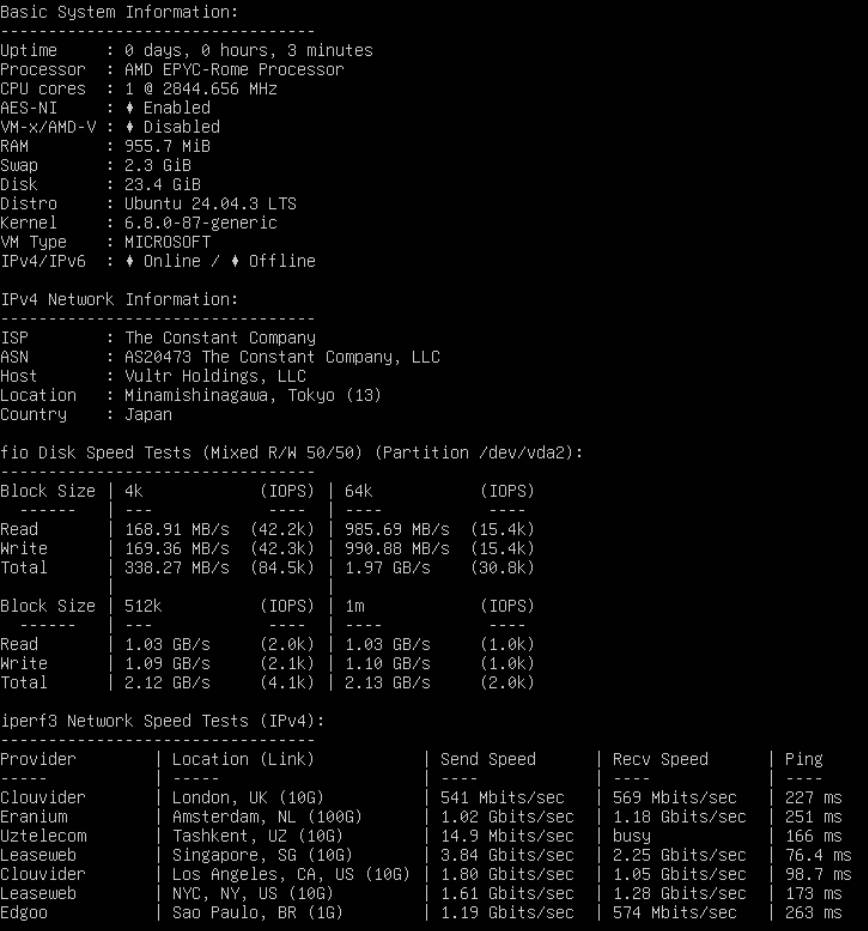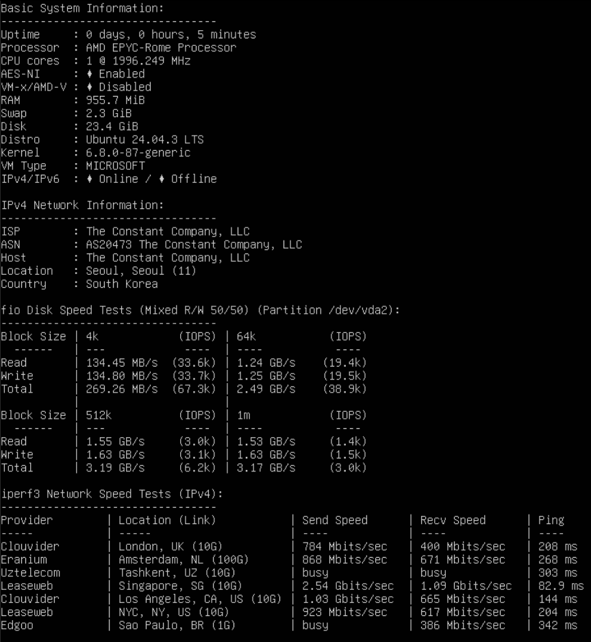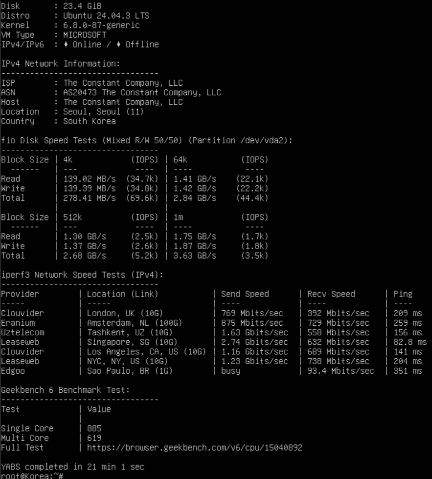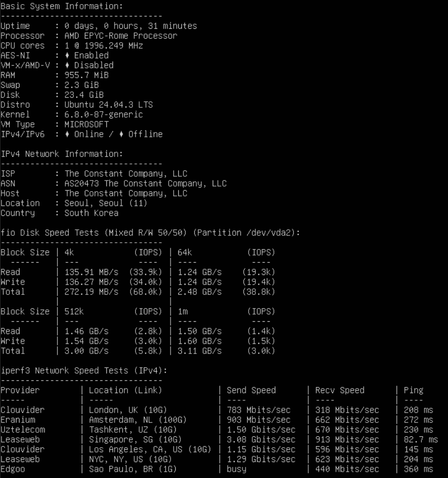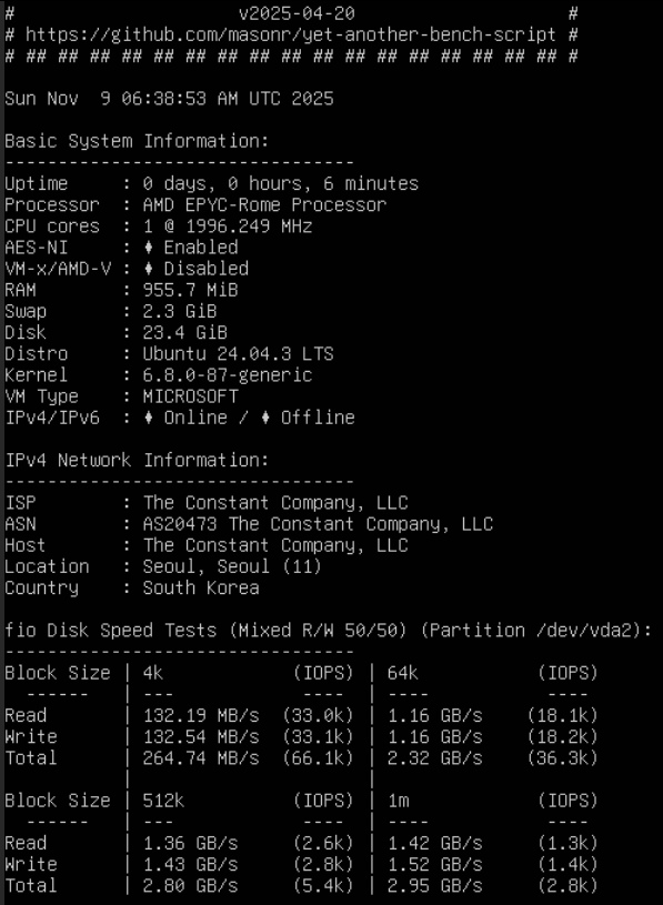 Kiểm tra ngẫu nhiên này cho thấy VPS ở Nhật ổn hơn đáng kể. Và việc cấp phát VPS, mặc dù có thông số định danh bề ngoài như nhau, hiệu suất thực tế khác nhiều (điểm geekbench của chúng chênh nhau gần 34%; IOPS 4k chênh nhau gần 38%). Điều này không có nghĩa là cứ chọn VPS ở Nhật thì sẽ có cấu hình thực tốt hơn ở Hàn, ở đây có khả năng cao chỉ là kết quả ngẫu nhiên. Nhưng có một điều chúng ta chắc chắn hơn: khả năng đồng bộ hiệu suất thực tế có vẻ không cao, ít nhất là lúc khởi tạo, tôi sẽ theo dõi thêm, ví dụ để sau 1 tuần xem các chỉ số, đặc biệt là geekbench có sàn sàn như nhau nữa không.