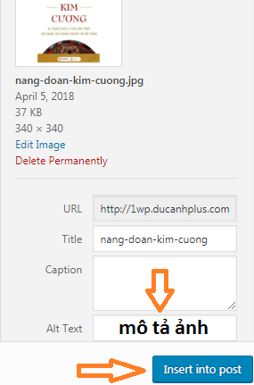 Ở phần Alt Text bạn không bao giờ được quên thêm nội dung mô tả bức ảnh vào, nếu không nó sẽ không tốt cho SEO (tối ưu hóa máy tìm kiếm). Ví dụ, giả sử ảnh bạn up là về cuốn sách Năng Đoạn Kim Cương chẳng hạn thì chỗ Alt Text bạn cần gõ: năng đoạn kim cương.
