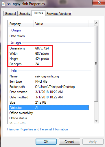 Nếu muốn biết kích cỡ của ảnh, bạn click vào ảnh trên máy tính của mình (hệ điều hành Windows), chọn Properties, chọn tiếp Details để có được thông số chiều rộng & chiều cao của ảnh tính ra px: