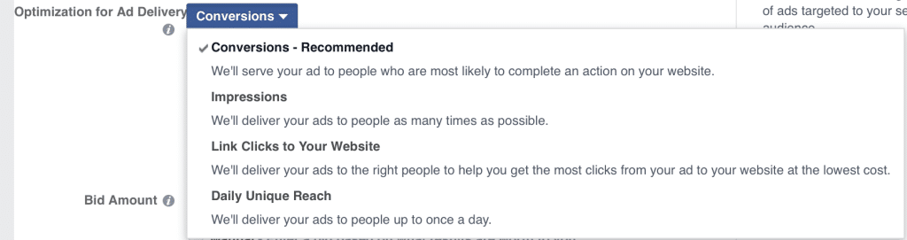 - Chuyển đổi: Facebook sẽ phân phối (deliver) quảng cáo của bạn tới những người có khả năng hoàn thành nhất mục tiêu hành động mà bạn chọn (như đặt hàng từ trang web của bạn). Họ đánh giá điều này dựa trên lịch sử của người dùng trong quá khứ (on past user history), và bạn sẽ trả tiền cho lượt hiển thị (CPM).
