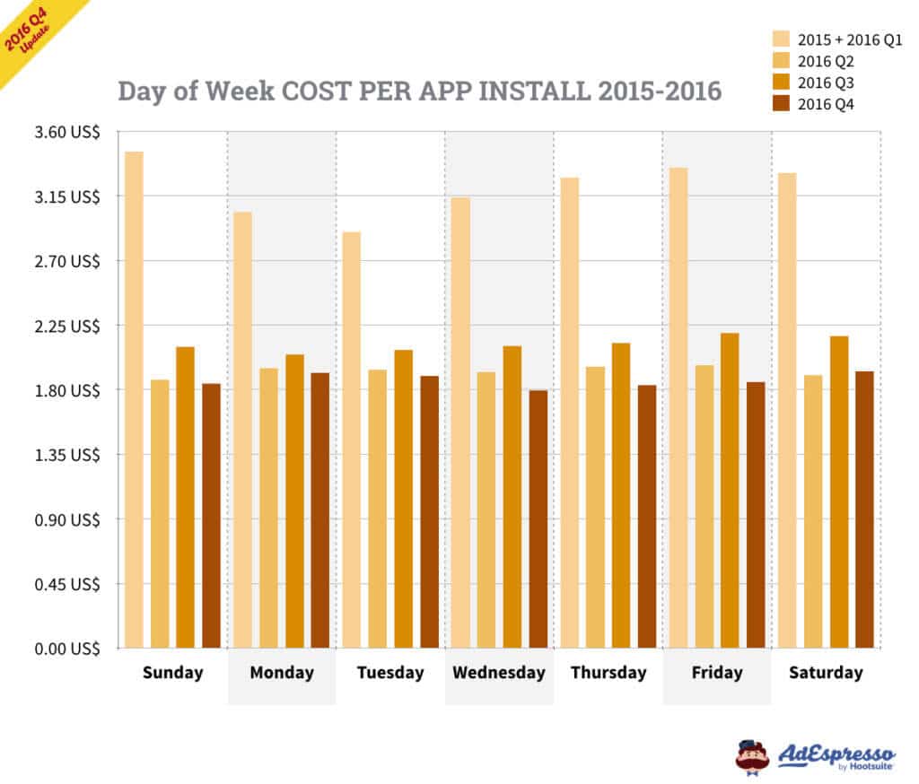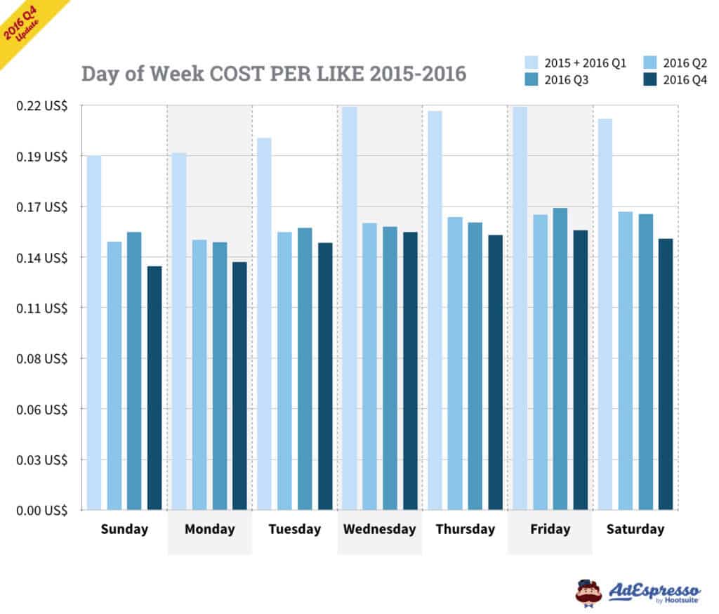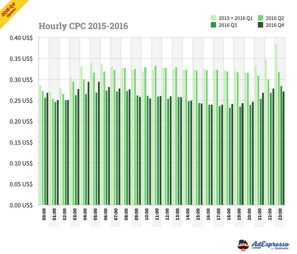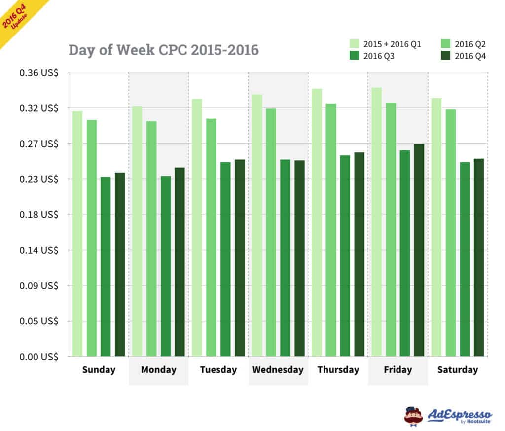 Tính đến Q3 năm 2016, ngày chủ nhật và thứ hai vẫn là những ngày có giá rẻ nhất dựa trên chi phí cost-per-click! Biểu đồ này cũng cho thấy toàn cảnh dữ liệu, CPC nói chung thấp nhất vào Q3.