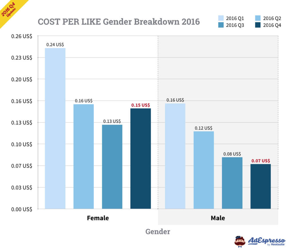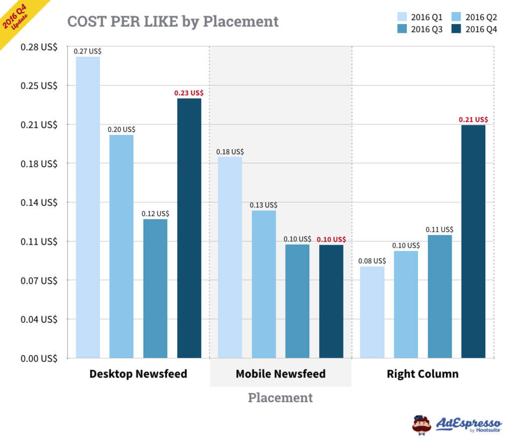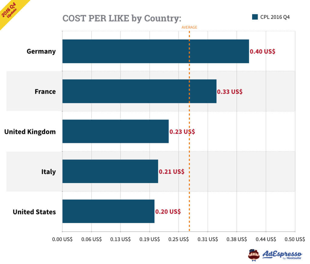 Chỉ tính riêng ở Mỹ, chi phí trung bình của CPC cho quảng cáo Facebook trong Q3 2016 là 27,29 cents (và 27,40 cents cho TẤT CẢ các mục tiêu). Chi phí cho 1000 lần hiển thị dựa trên Q3 là 7,19 đô (và 7,34 đô CPM cho TẤT CẢ các mục tiêu).