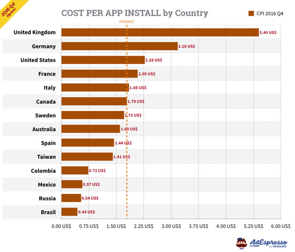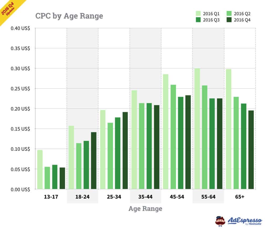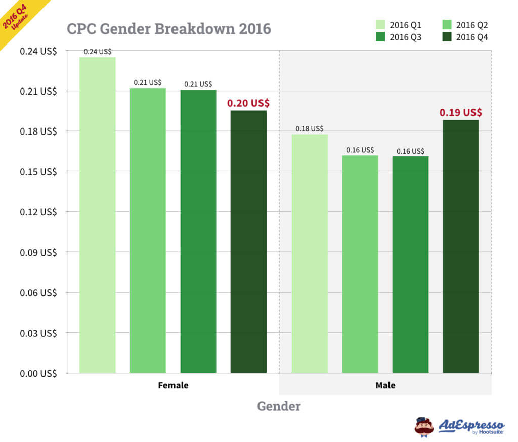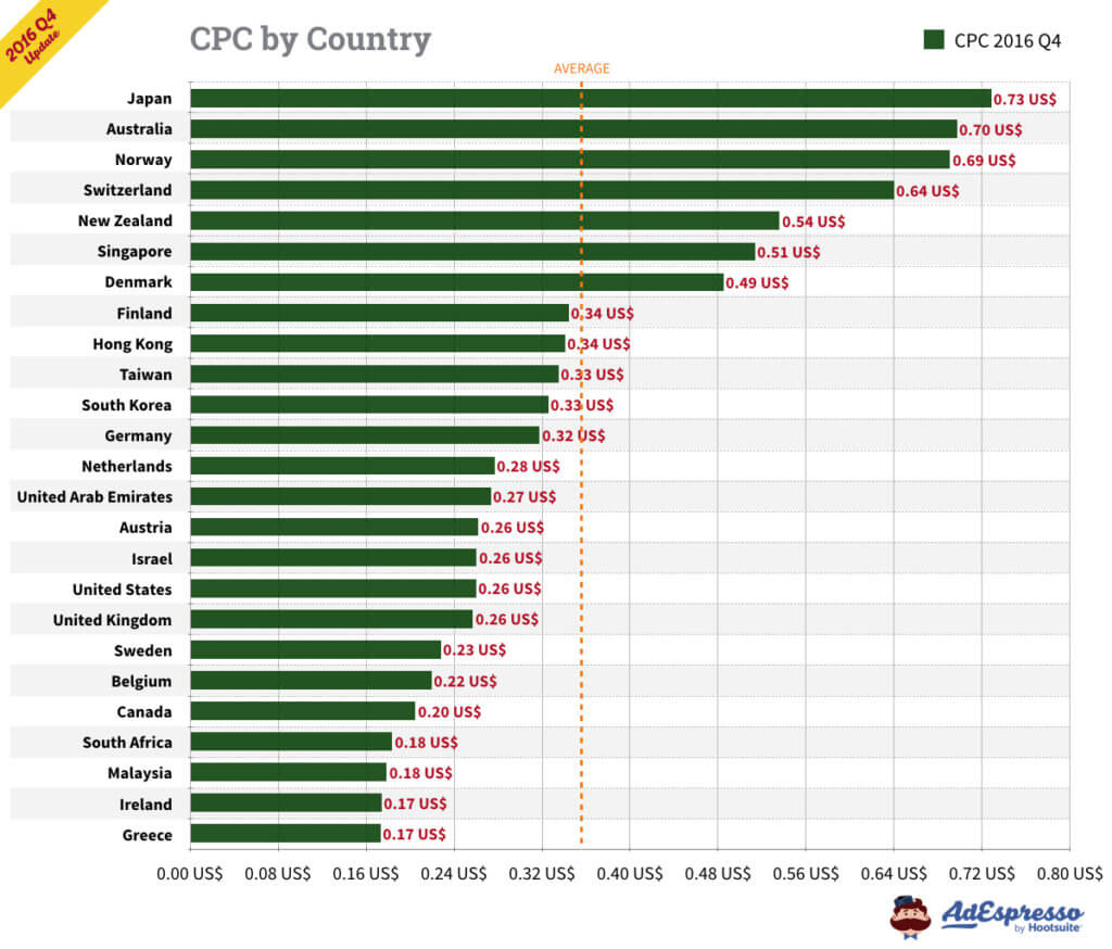 Chỉ tính riêng ở Mỹ, chi phí trung bình của CPC cho quảng cáo Facebook trong Q3 2016 là 27,29 cents (và 27,40 cents cho TẤT CẢ các mục tiêu). Chi phí cho 1000 lần hiển thị dựa trên Q3 là 7,19 đô (và 7,34 đô CPM cho TẤT CẢ các mục tiêu).