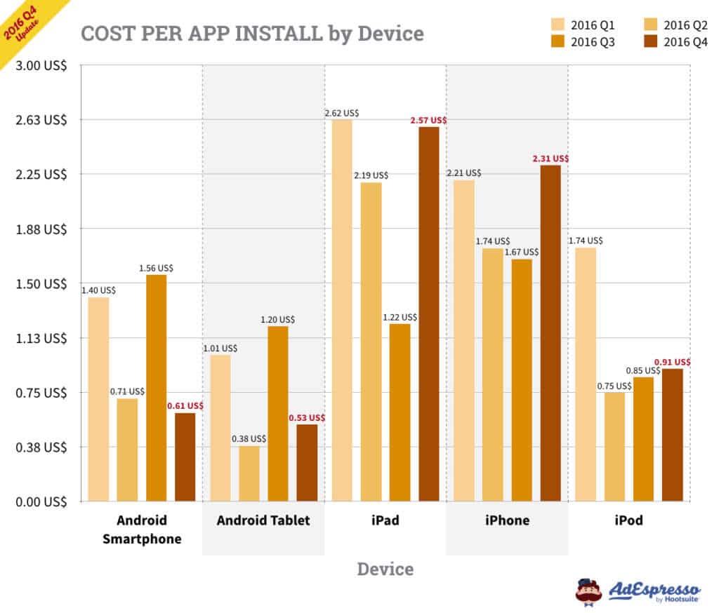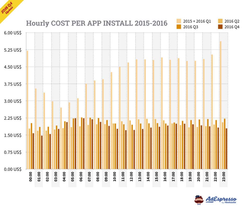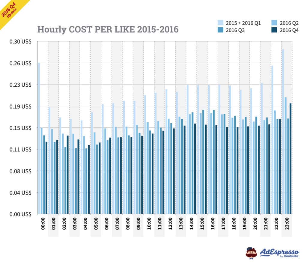 Đây là dữ liệu chúng tôi lấy về từ tất cả người dùng của AdEspresso từ cuối năm 2015, Q1, Q2, và Q3 năm 2016! Thông tin của hơn 150 triệu đô quảng cáo đã được nhập vào và phân tích bởi chúng tôi chỉ riêng trong quý 4 (Q4). Tất cả loại tiền tệ đều được chuyển đổi sang USD trong dữ liệu này.