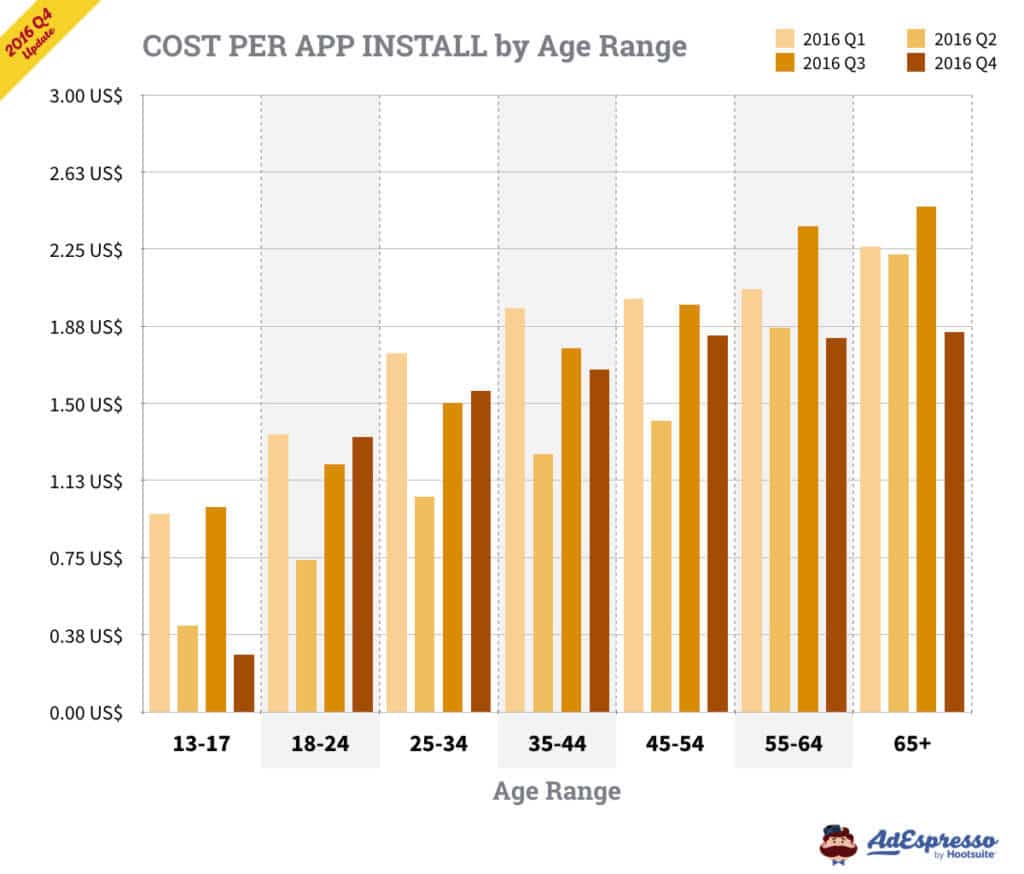 Chi phí lượt cài đặt ứng dụng tính theo độ tuổi: