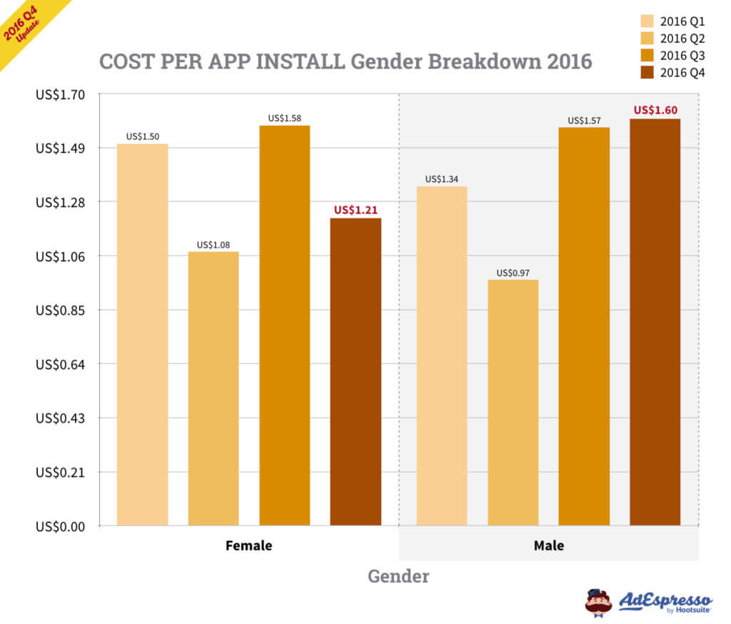 Chi phí lượt cài đặt ứng dụng tính theo giới tính: