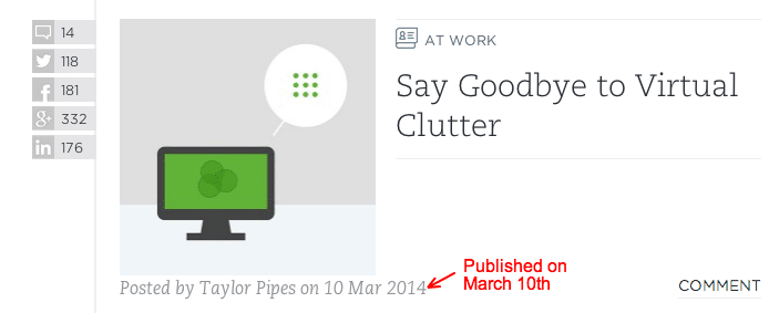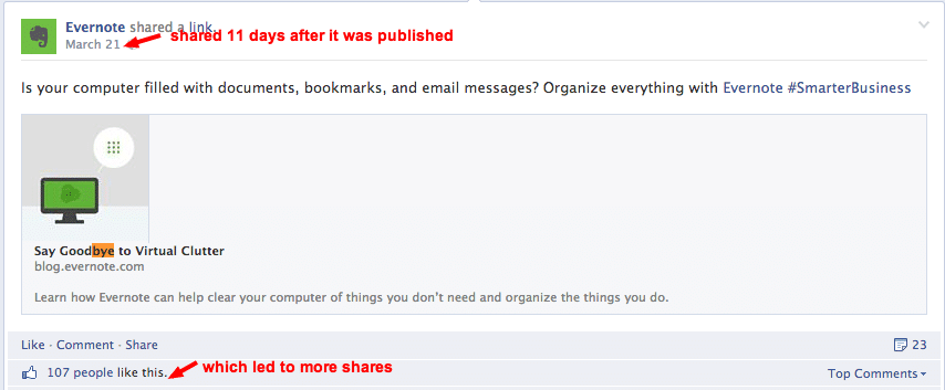 Một bài viết trong số đó là bài blog của Evernote xuất bản vào ngày 10 tháng ba chỉ nhận được 23 lượt chia sẻ Facebook sau một tuần. Tuy nhiên, sau một tháng, có tổng cộng 181 lượt chia sẻ, tăng 686% sau 3 ngày.