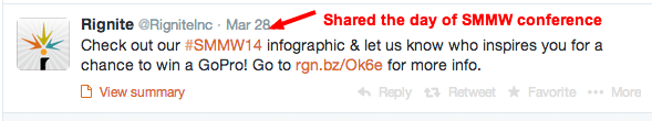 Nhưng nếu nội dung bài viết cũ của bạn không tươi mới thì sao? Vẫn còn một cách để quảng bá bài viết cũ nếu nó có quan hệ với sự kiện sắp tới. Ví dụ, chúng tôi tìm thấy một infographic về các nhân vật có ảnh hưởng sẽ gặp mặt ở SMWW (một hội thảo về marketing mạng xã hội) có 72 twitter chia sẻ sau một tuần, nhưng có tới 487 twitter chia sẻ sau một tháng. Bí mật của họ là gì?