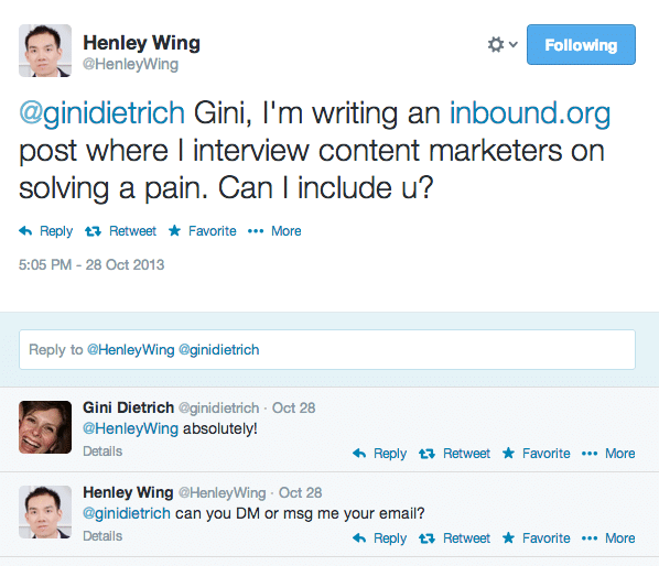 Phỏng vấn người khác cũng có thể là cách hay nhất để có được sự tham gia của mọi người. Tại BuzzSumo, các bài blog được chia sẻ nhiều nhất có hơn 500 share. Chúng tôi phỏng vấn hơn 40 người trong lĩnh vực SEO và mỗi người trong các cuộc phỏng vấn đều chia sẻ bài đăng đó với khách hàng, fan của họ. Đây là hình chụp màn hình một tweet chúng tôi hỏi mọi người nếu họ muốn phỏng vấn. Hầu hết các phản hồi đều rất tích cực.