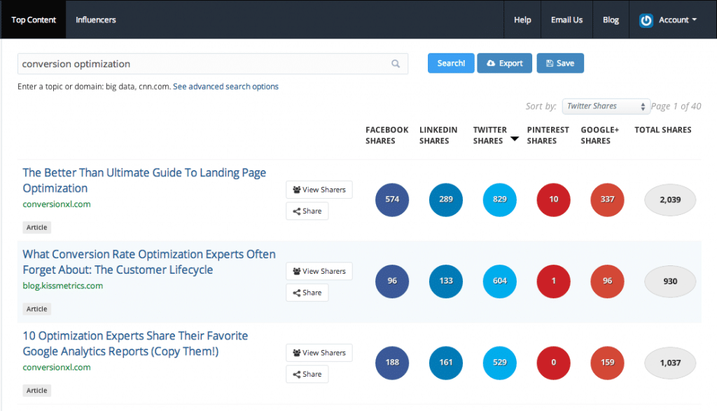 Ví dụ cụ thể, chẳng hạn bạn muốn viết một bài về “tối ưu hoá chuyển đổi” (conversion optimization). Với BuzzSumo, bạn có thể tìm tất cả các bài viết được chia sẻ nhiều nhất về chủ đề tối ưu hoá chuyển đổi trong 6 tháng gần đây bằng cách sử dụng chức năng Top Content Search.