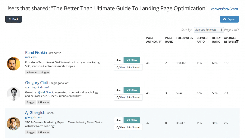 Kết quả đầu tiên có 2039 chia sẻ và nó đến từ trang conversionxl.com. Bạn có thể nhìn thấy người chia sẻ bài viết đó bằng cách click vào nút “View Sharer – Xem Người Chia Sẻ”. Ở đây bạn sẽ thấy danh sách những người chia sẻ bài viết trên Twitter, được sắp xếp theo số lượng chia sẻ lại trung bình. Nói cách khác, nó được sắp xếp theo mức độ ảnh hưởng của họ.