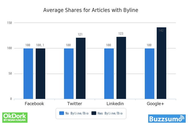 Mặc dù vậy, độ tin cậy dường như không tạo khác biệt nào trên Facebook. Bài viết với thông tin tác giả hoặc tiểu sử chỉ có thêm 0,10% lượng chia sẻ so với không có thông tin tác giả/tiểu sử. Ngược lại, với Google+, các bài viết có thông tin tác giả/tiểu sử nhận được thêm 42% lượng chia sẻ so với không có.