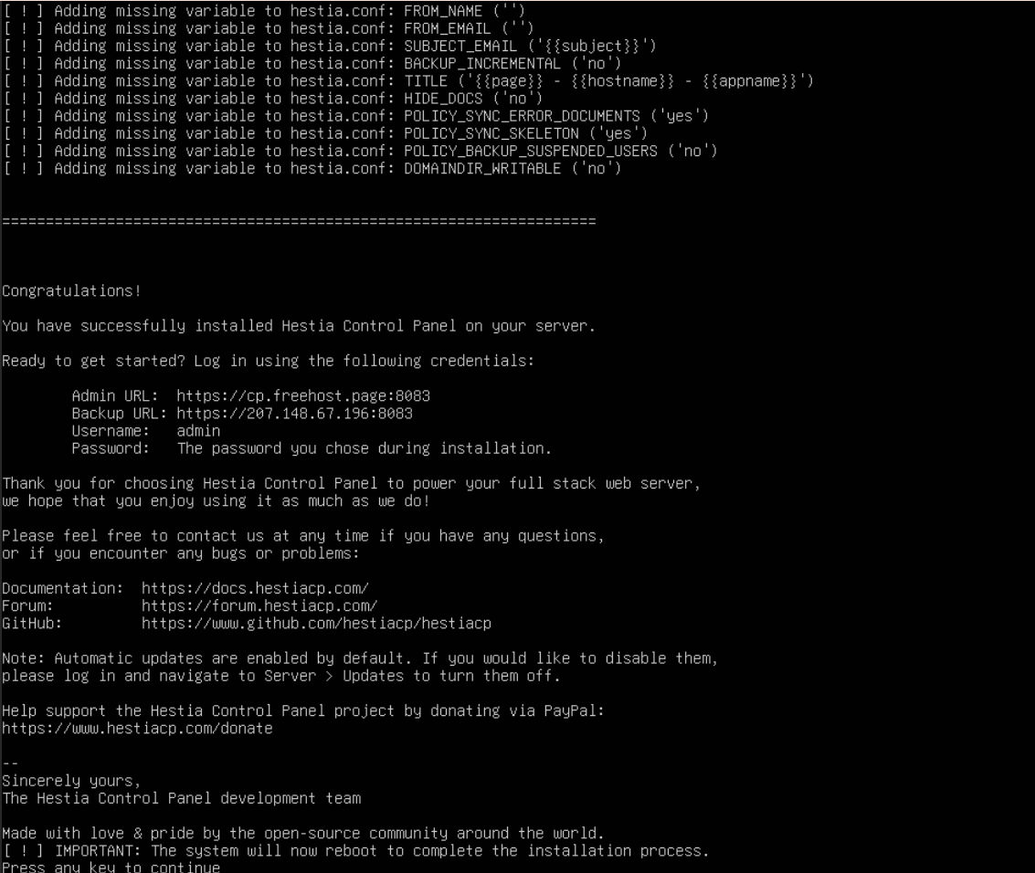 - pass đăng nhập: tùy ý bạn, nhưng đừng quên, vì còn dùng nó để đăng nhập HestiaCP