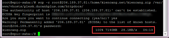 Và đây là câu lệnh SSH cụ thể của tôi, để chuyển file .zip từ CyberPanel về Plesk:
