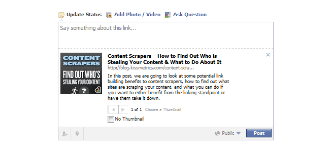 Điều đấy nghĩa là nếu các câu đầu tiên trên trang của bạn không tóm tắt nội dung tốt, những ai thấy chia sẻ có thể lỡ mất điểm quan trọng. Vì thế, nếu bạn muốn chia sẻ của mình nhận được nhiều click trên mạng xã hội, hãy xem xét việc tạo các nội dung cho thẻ meta description thực sự nghiêm túc để nó khuyến khích click, giống như bạn muốn trên trang kết quả tìm kiếm.