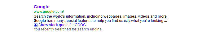 Trớ trêu là, Google không liệt kê bản thân nó trong kết quả tìm kiếm khi bạn tìm kiếm từ khóa “search engine / máy tìm kiếm” vì vậy bạn phải tìm kiếm từ Google để thấy các kết quả trên. Và họ là người duy nhất cắt bỏ một phần mô tả của chính mình (Yahoo và Bing thì vẫn hiện đủ toàn bộ mô tả của Google).