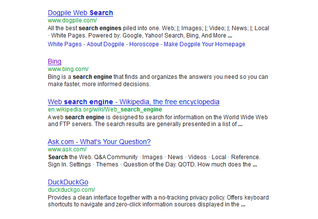 Ngay cả nếu từ khóa bạn sử dụng trong thẻ meta description không giúp thăng hạng tìm kiếm, nó vẫn giúp bạn có được sự chú ý của người tìm kiếm. Khi một ai đó tìm kiếm cho một từ khóa hoặc cụm từ cụ thể, nó sẽ được bôi đậm trong máy tìm kiếm nơi nào nó xuất hiện. Vì thế nếu bạn nhắm đến từ khóa nào, bạn sẽ muốn nó nổi bật. Trong nhóm các kết quả tìm kiếm cho từ khóa search engine, những kết quả nào đập vào mắt bạn?