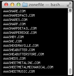 File zone, cho những ai không quen thuộc với nó, đây là file text khổng lồ được phân phối bởi Verisign liệt kê tất cả các tiền miền đã đăng ký cho một kiểu tên miền cấp cao nhất cụ thể (LTD), như .com, .net, .org, vân vân. Ví dụ, file zone cho đuôi .com bao gồm khoảng 100 triệu tên miền. Hình bên dưới là một phần nhỏ của nó giúp bạn hiểu file này trông như thế nào: