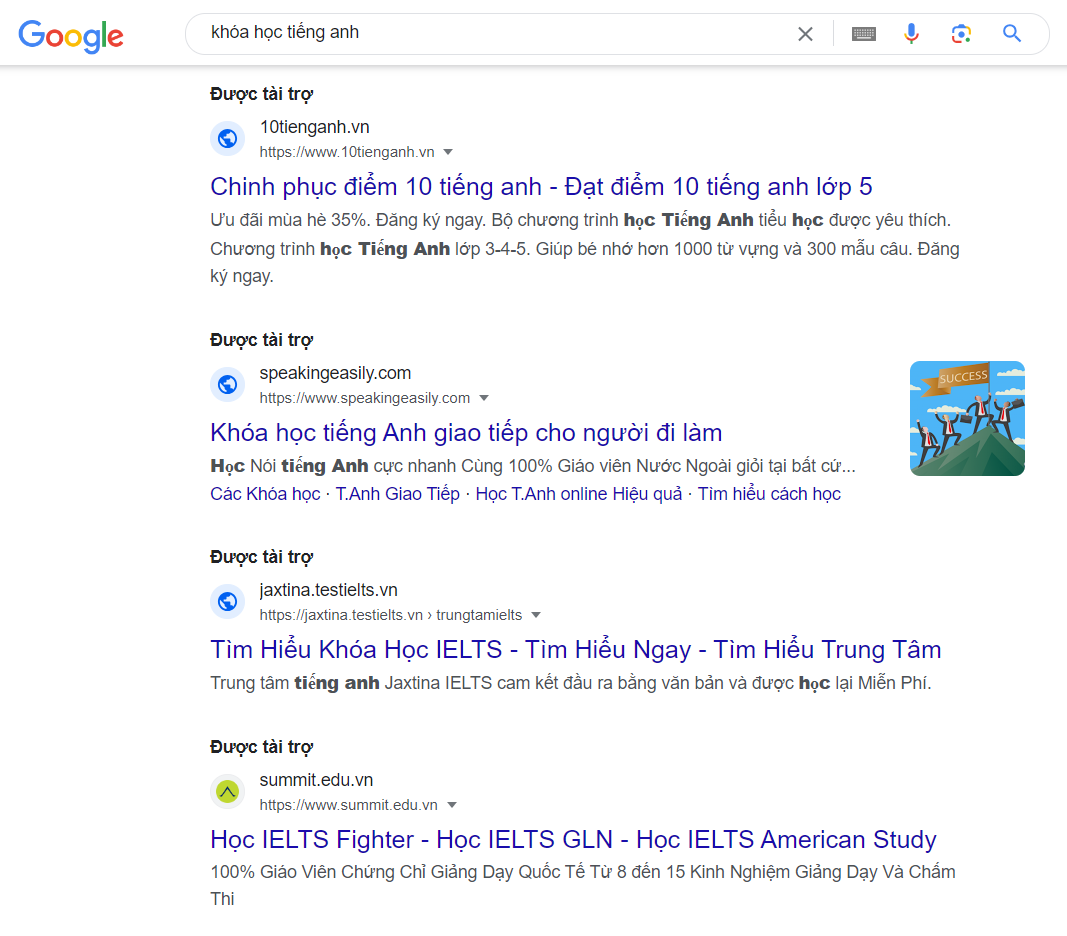 Nếu tôi thử tìm kiếm nhanh cho từ khóa “khóa học tiếng anh”, gần như tất cả các quảng cáo đều trông giống nhau nếu bạn chỉ nhìn vào phần văn bản. Nhưng có một cái nổi bật lên thu hút sự chú ý của bạn? Đó là quảng cáo của trang speakingeasily.com với tiện ích ảnh.