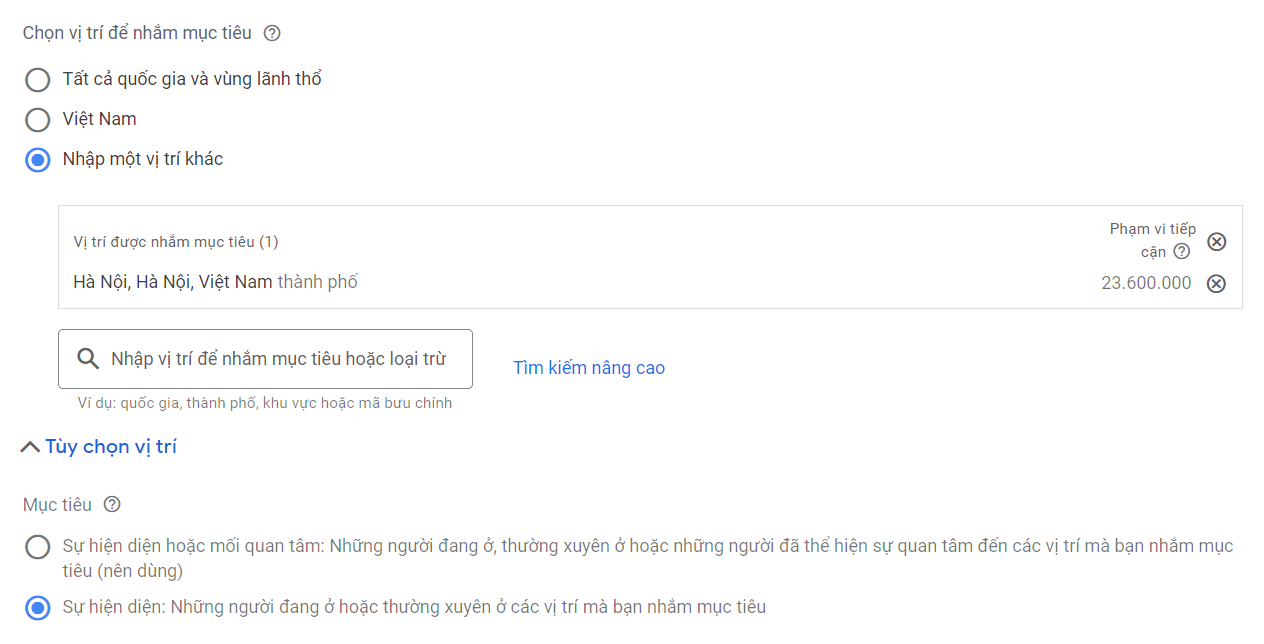 Không có ý nghĩa nào hết nếu bạn quảng cáo cho những ai mà bạn không thể phục vụ hoặc không đem lại lợi nhuận cho bạn. Google Ads có khả năng tùy biến cao trong tùy chọn nhắm theo vùng địa lý (location targeting), bạn nên sử dụng nó để bao gồm các vùng tốt nhất và loại trừ những vùng có khả năng gây lãng phí ngân sách.