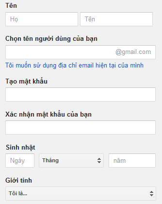 - Mật khẩu và xác nhận mật khẩu – vì mật khẩu hiển thị dấu * để bảo mật nên đa số trường hợp có thêm trường xác nhận để tránh gõ nhầm. Ngoài ra Google cung cấp thông tin độ mạnh của mật khẩu để người dùng thấy có nên chọn mật khẩu này không
